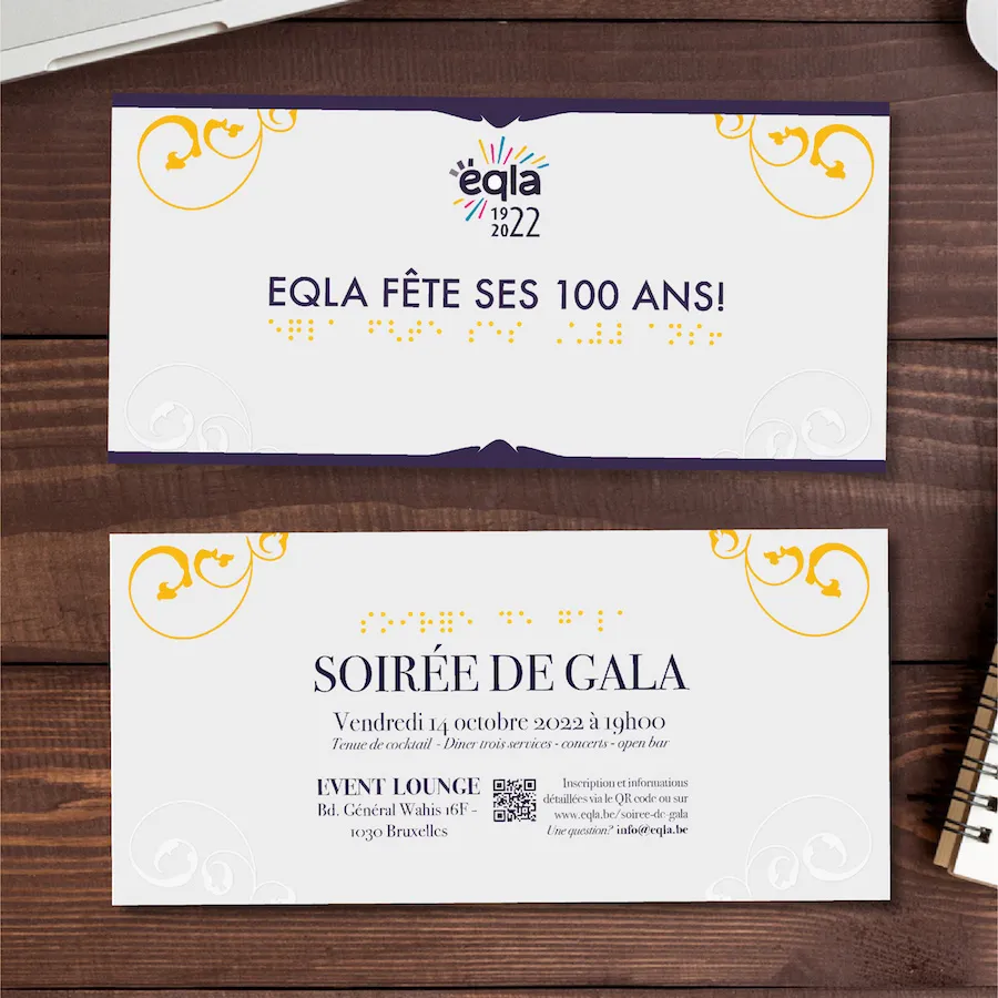 J’ai également conçu l’invitation à la soirée de gala consacré à la récolte de fonds. Comme EQLA est une assoiciation qui se consacre à visibiliser les enjeux de la malvoyance, il fallait qu’elle soit aussi lisible en braille, avec des motifs en relief inclus dans la composition.Le site internet